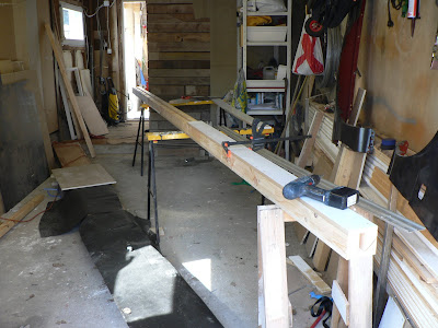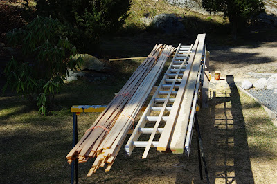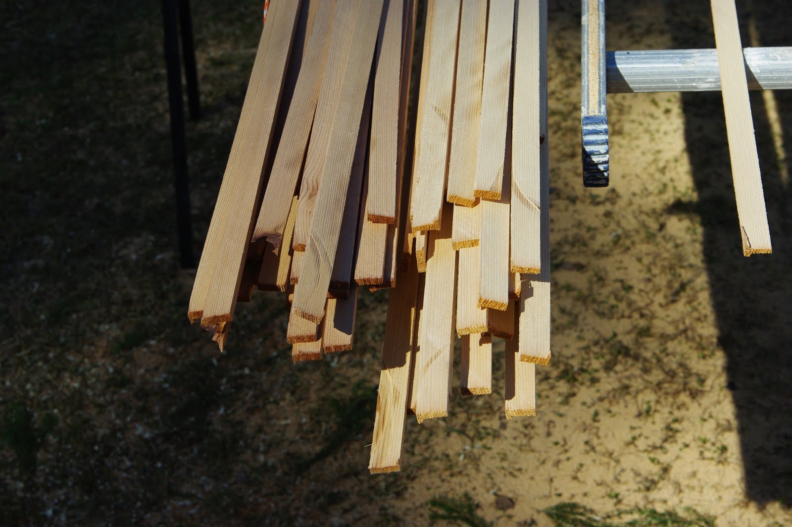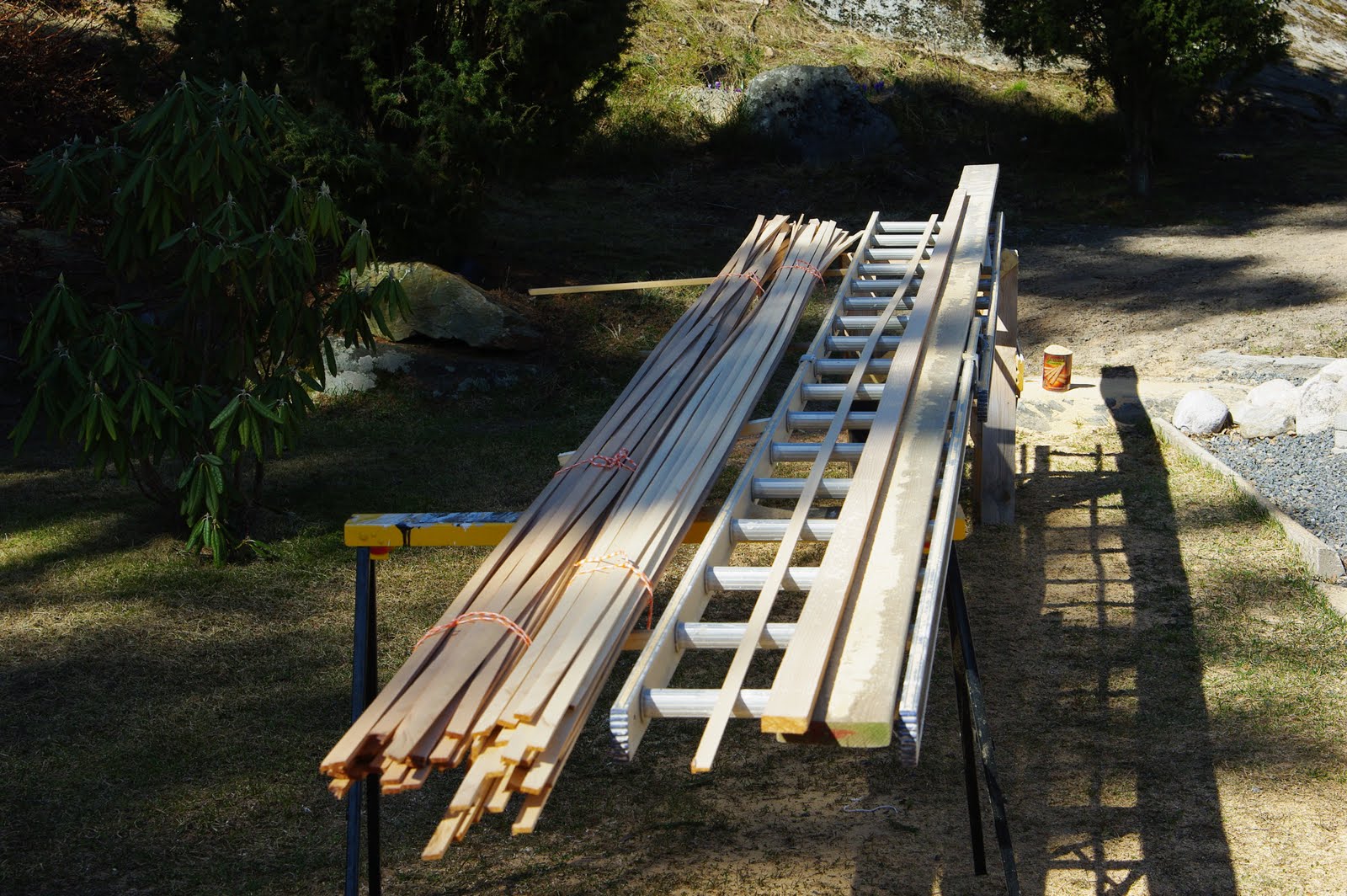 Nå aamupäivällä 2½ tuntia meni listoja sahaettassa,kaikki kolme lautta sahattu ja listat valmiina.2 lautaa oli tummempaa ja kolmas hieman vaaleampi puuta,pitäsi kehittä joku kuvio kun asettelee listat niin että kajakista saa siistin näköinen.