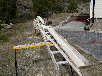 På förmiddagen gick 2½ t. till att såga ribbor. Alla 3 bräden nu sågade till tunna ribbor.