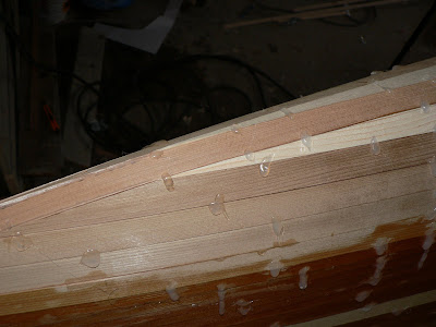 Akterstäven ^^, på bilden syns också hålen av några klammer jag måste sätta dit för att ribborna skulle hållas fast i inner stäven, lika hål hade funnits vid alla spant runt hela skrovet, om jag anv. klammer, visst hade jag sluppit vissa glipor mellan ribborna med klammer, men tycker ändå bättre om de än alla klammer hål.Får försöka minska på gliporna när däcket ska ribbas, är ju ändå det som syns mera då kajaken är på rätt köl :).